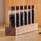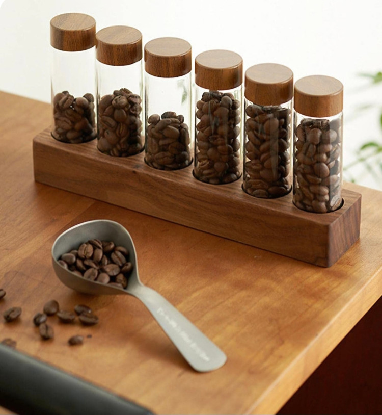 این محصول از استوانه های شیشه ای با درب کیپ شونده و پایه چوبی بسیار زیبا از جنس بامبو ساخته شده است که گزینه بسیار مناسبی برای روی بار کافی شاپ
