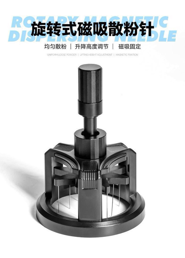 شامل یک سری سوزن (نیدل) است که به صورت چرخشی کار میکند و به توزیع یکنواخت قهوه آسیابشده در پرتافیلتر کمک میکند. طراحی مگنتی این ابزار، دقت و راحتی استفاده را به طرز چشمگیری افزایش داده و برای کافههای حرفهای و مصرف خانگی پیشرفته ایدهآل است.